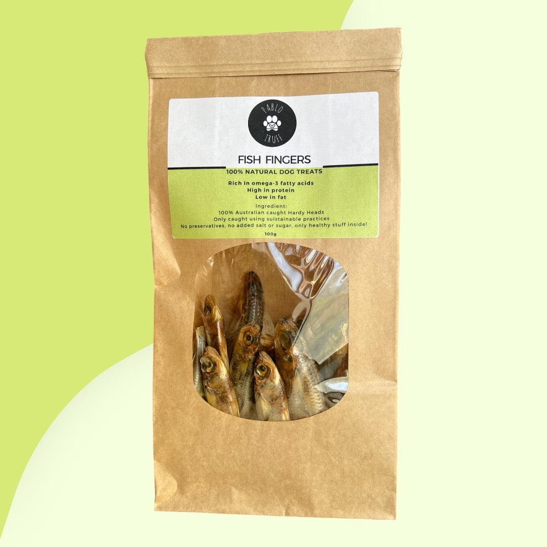 Our Fish Finger dog treats are crafted exclusively from small, Australian bait fish or other known as Hardy Head. These treats are the smallest in our range, offering a low-fat, high-protein snack rich in omega-3 fatty acids. These nutrients can enhance your dog's coat and help alleviate joint inflammation, promoting overall health and vitality.