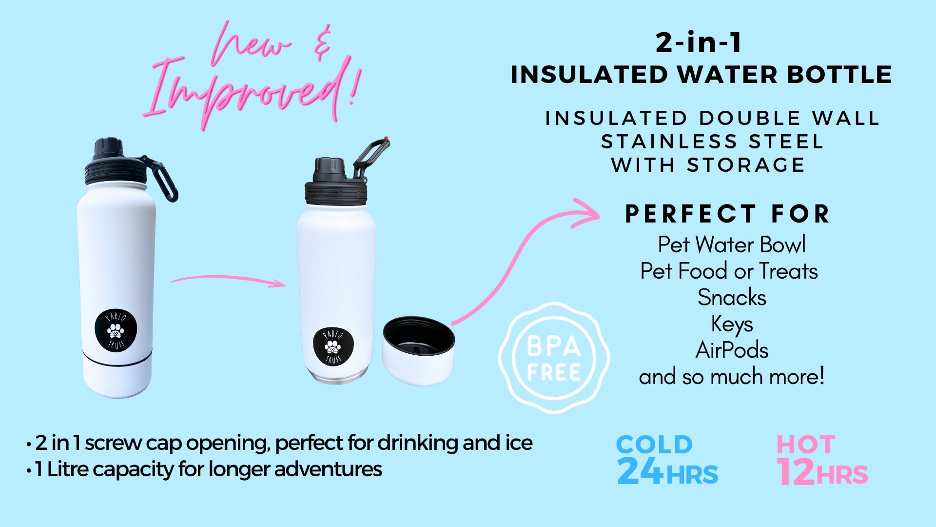 Meet the ultimate adventure companion for you and your furry friend. This versatile, double-walled stainless steel bottle keeps drinks cold for up to 24 hours or hot for up to 12, while the detachable base doubles as a water bowl for your pet.